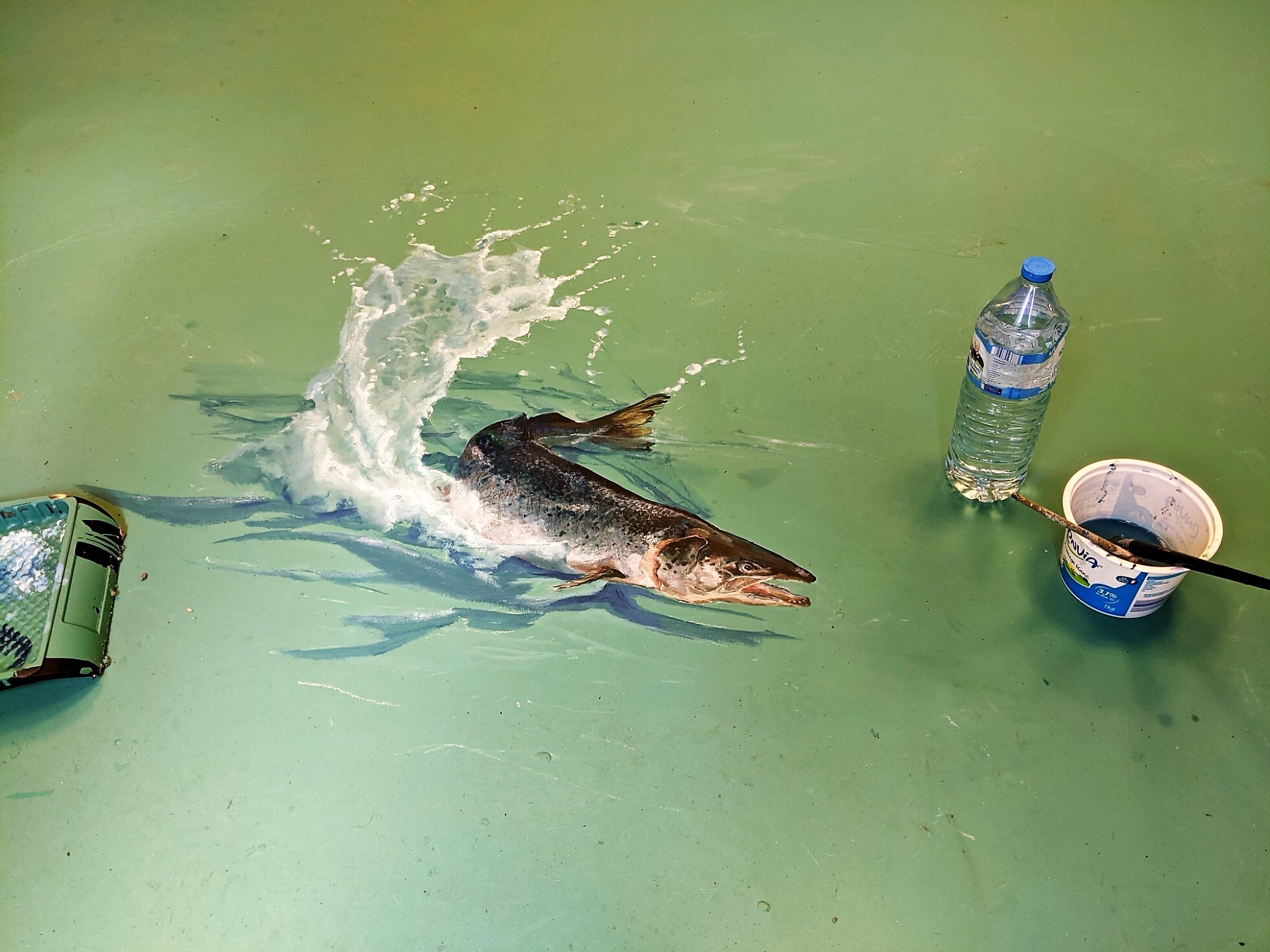 Vloerschildering met een levensechte zalm in het Zeeuwse Rookhuis...
