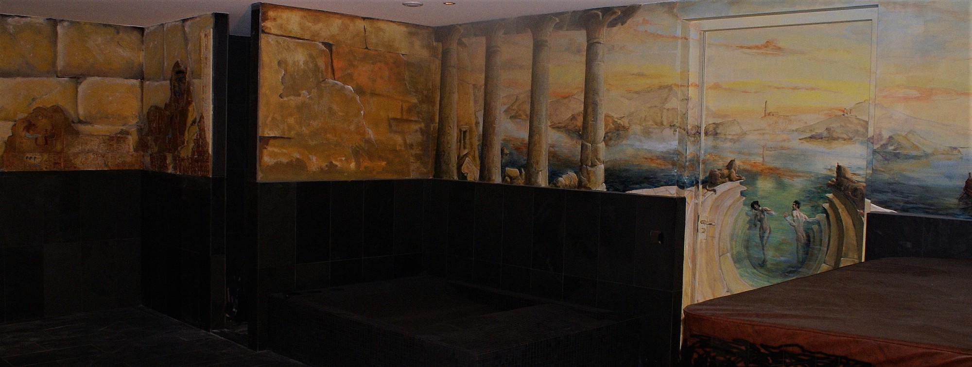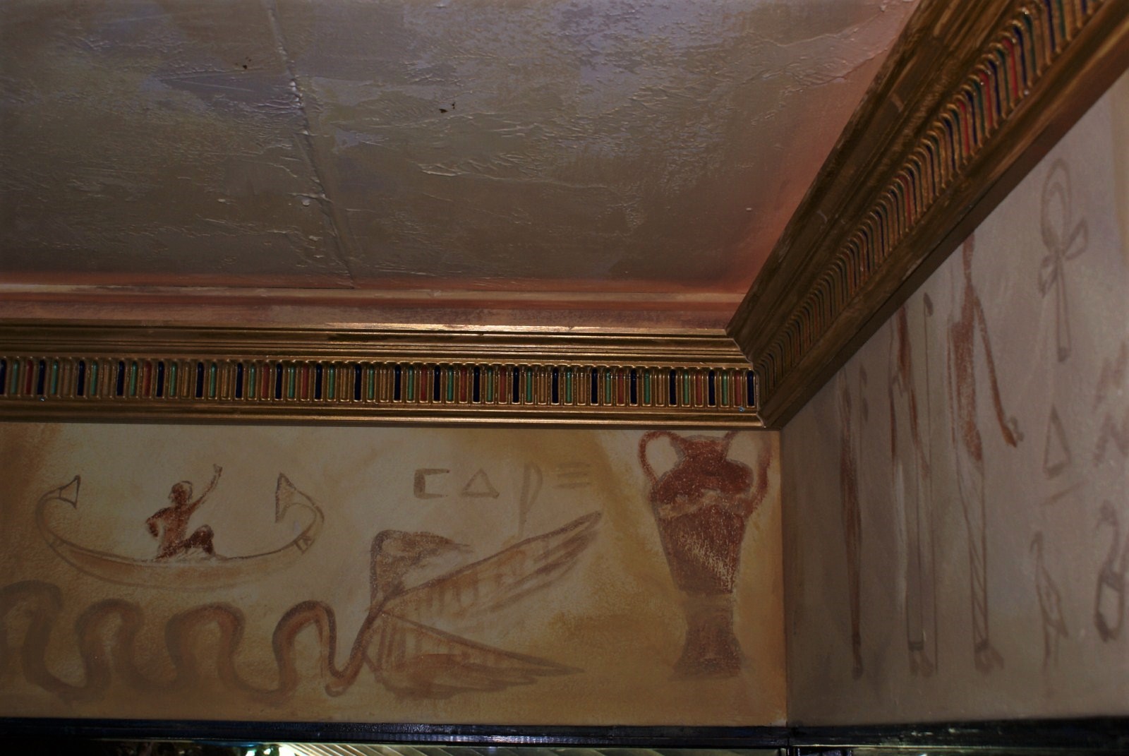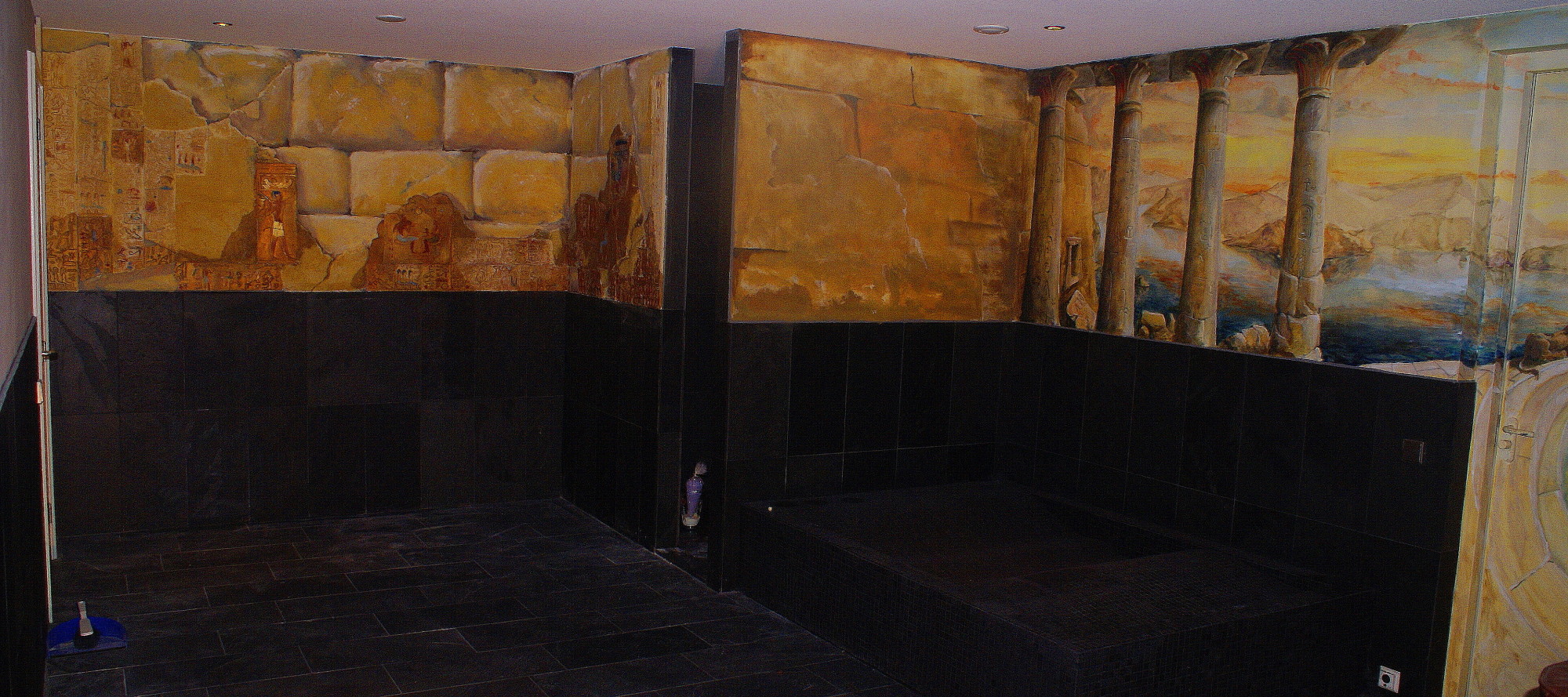Diverse Egyptische muurschilderingen op verschillende locaties afgewerkt met 3D effecten en Egyptische ornamenten uit eigen gieterij.