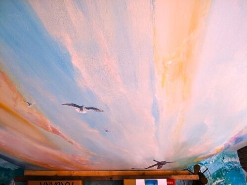 Terug naar overzichtDeze kleurrijke persoonlijke plafondschildering heeft vele symbolen. De vraag was of ik een schildering kon maken waar de overleden zoon op zijn snowboard in verwerkt is en symbolisch een vriend die vliegtuigbouwer bij Fokker was.