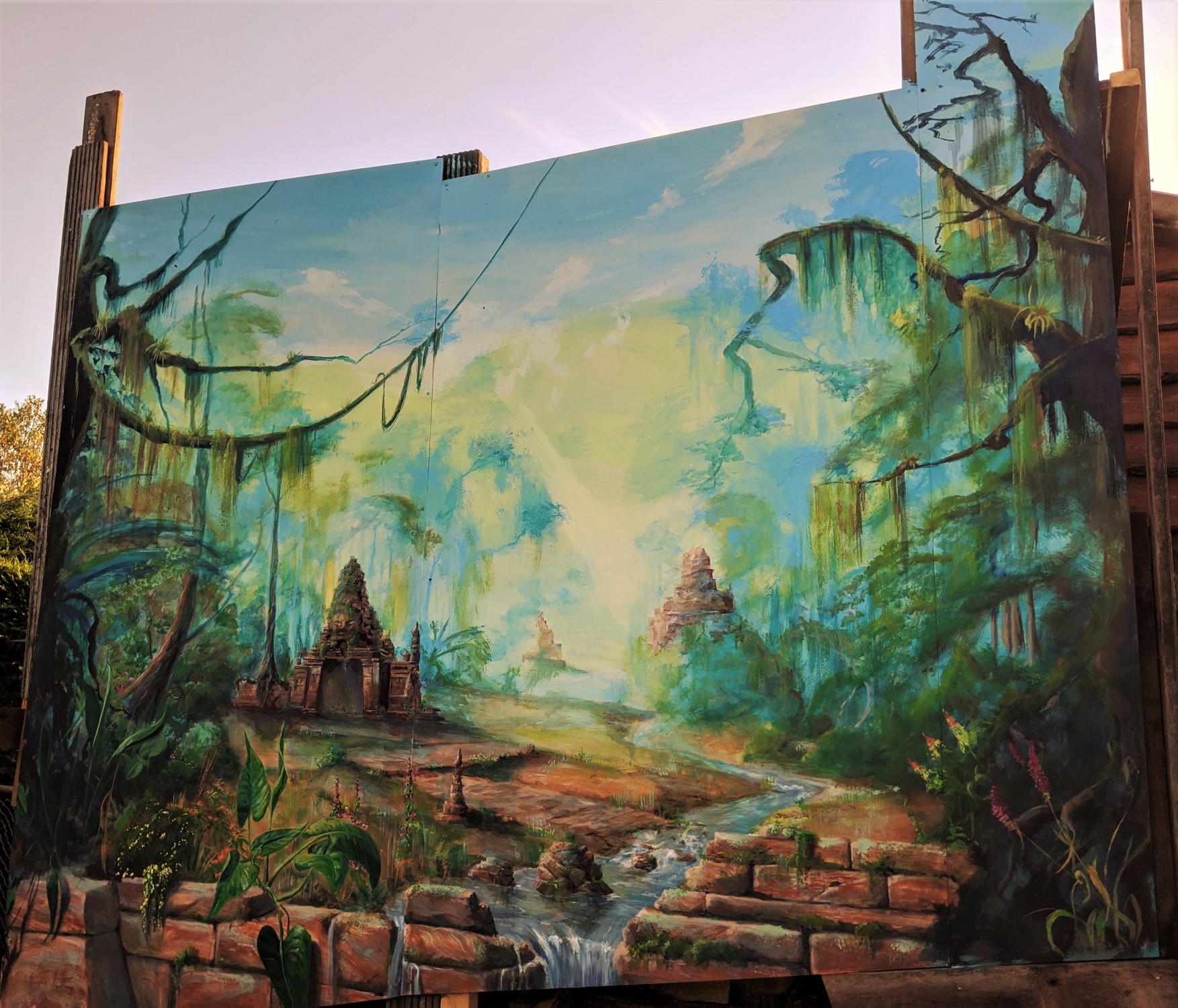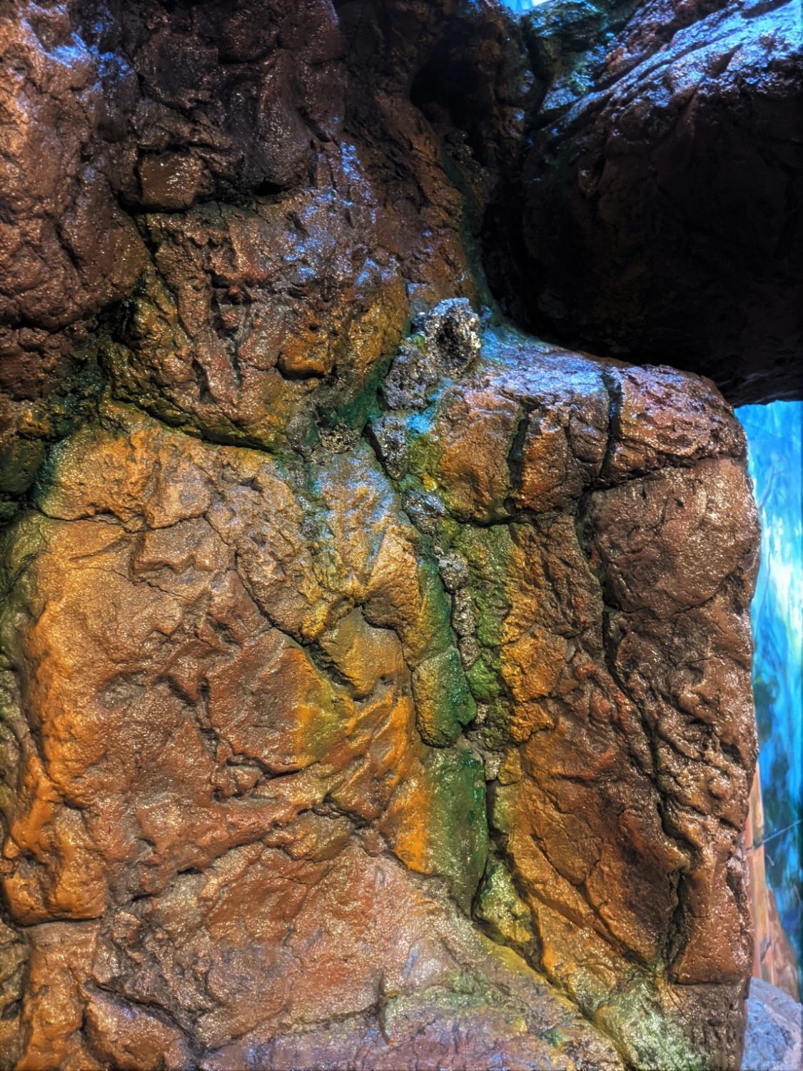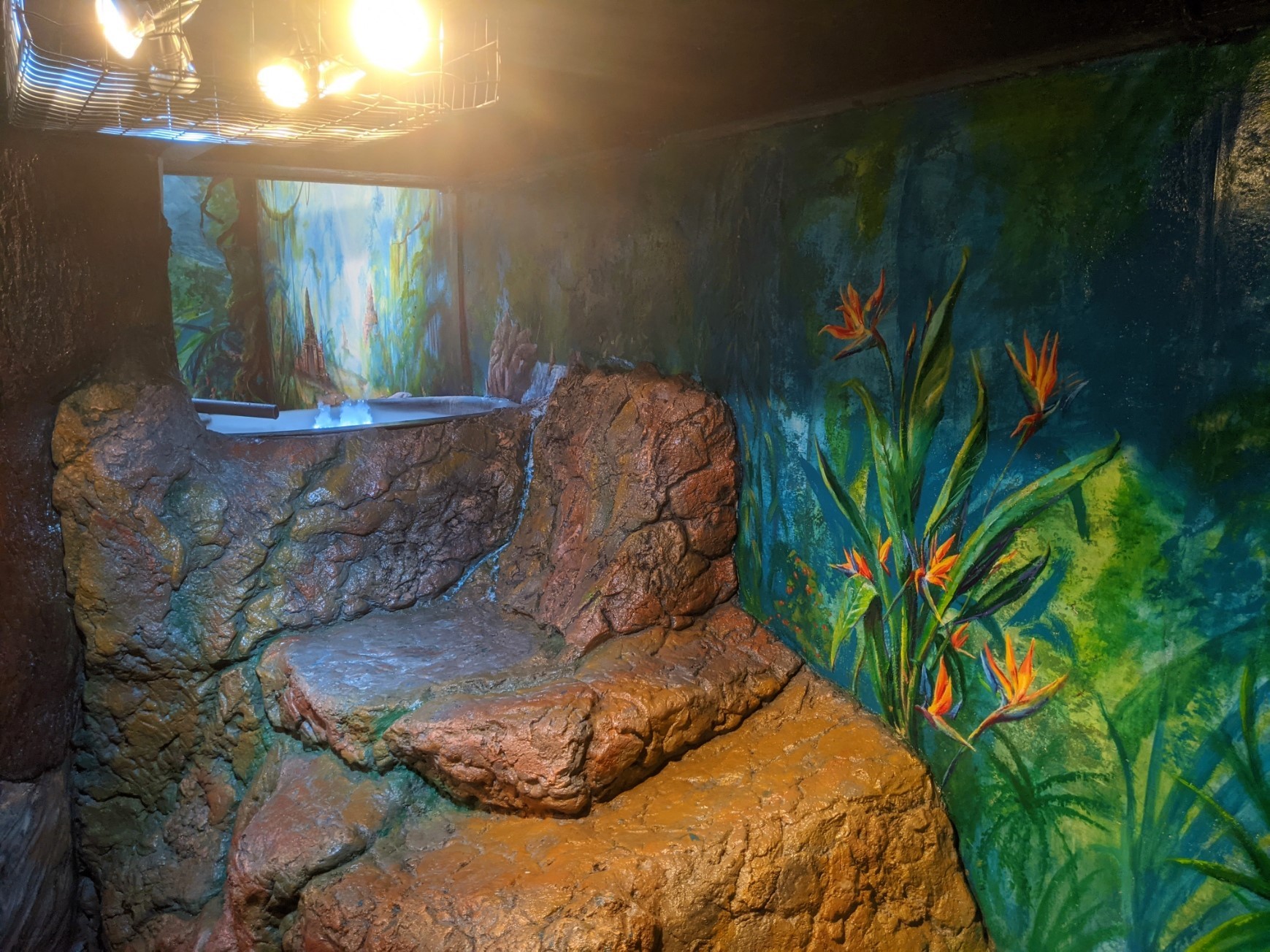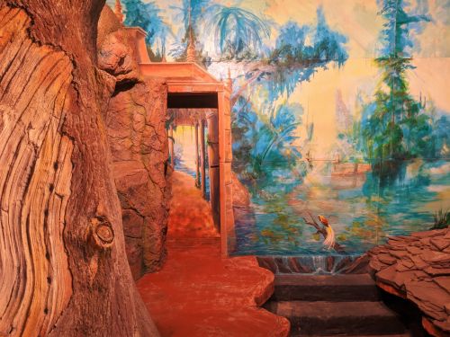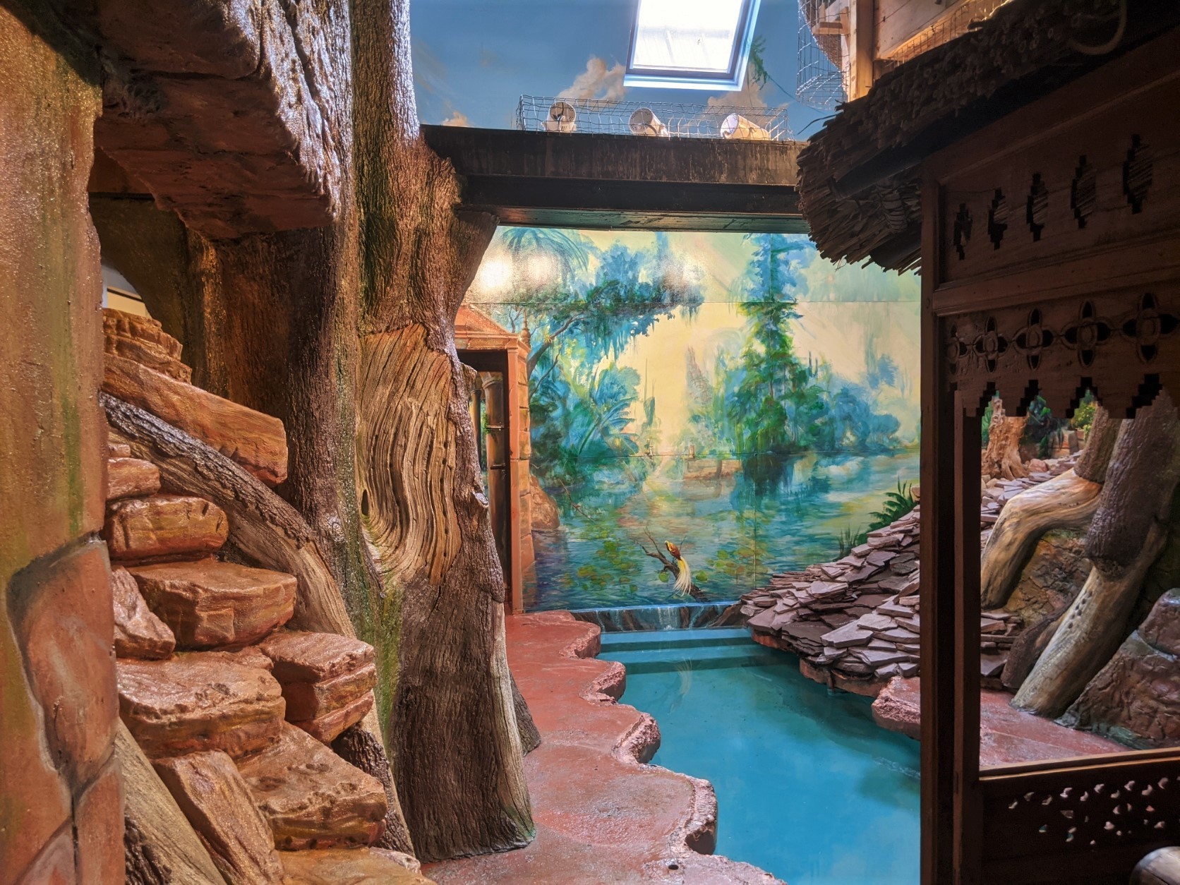 Op verschillende plekken is er ook optisch bedrog, door 3D schildertechnieken, zoals bomen die op t plafond doorlopen en geschilderde watervallen die overgaan in echte watervallen.