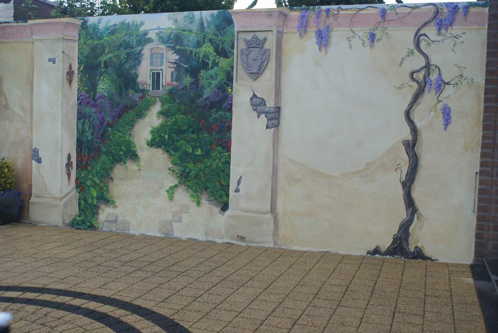 Muurschildering met geschilderde poort waardoor men naar de tuin van Monet kijkt, met veel optisch bedrog......