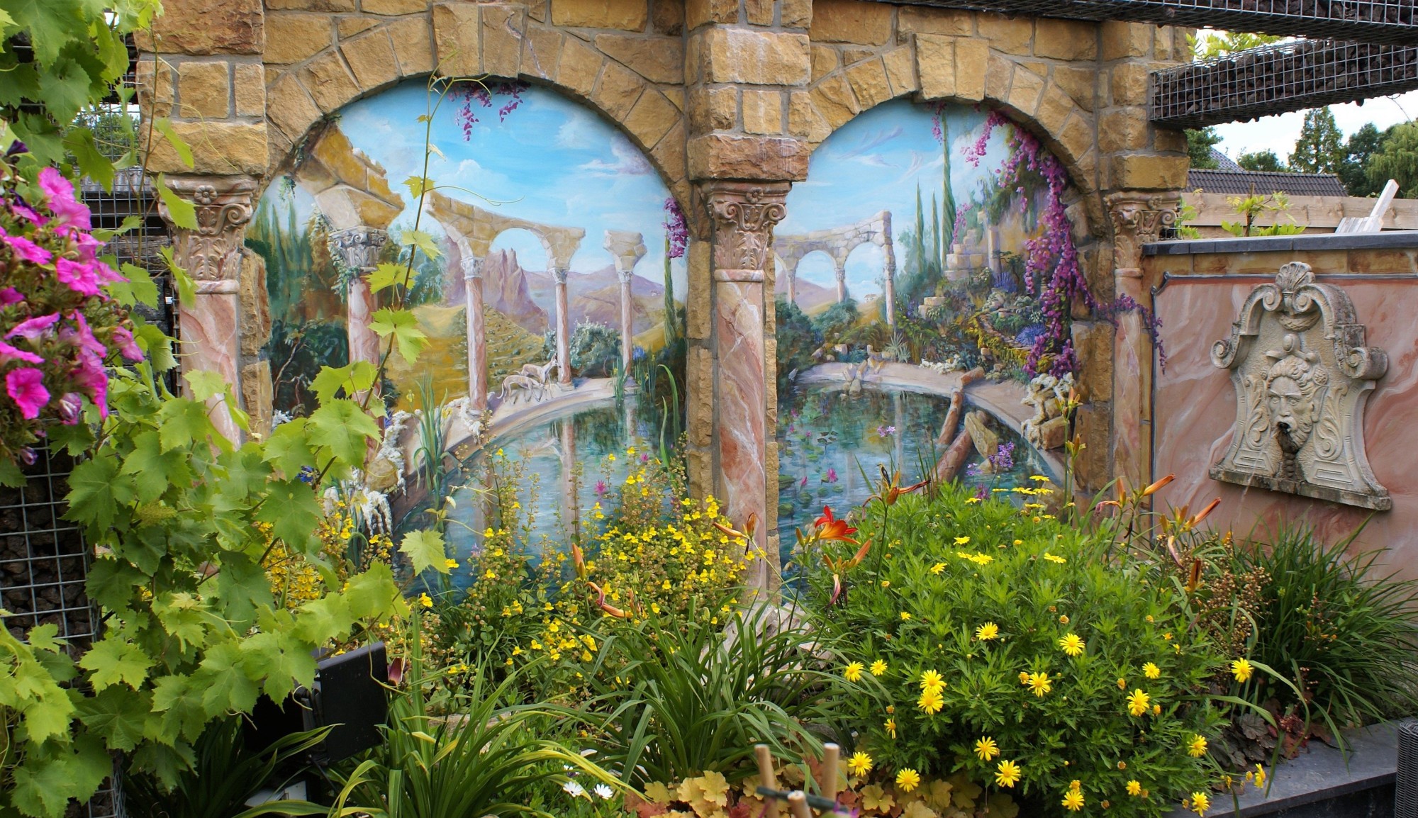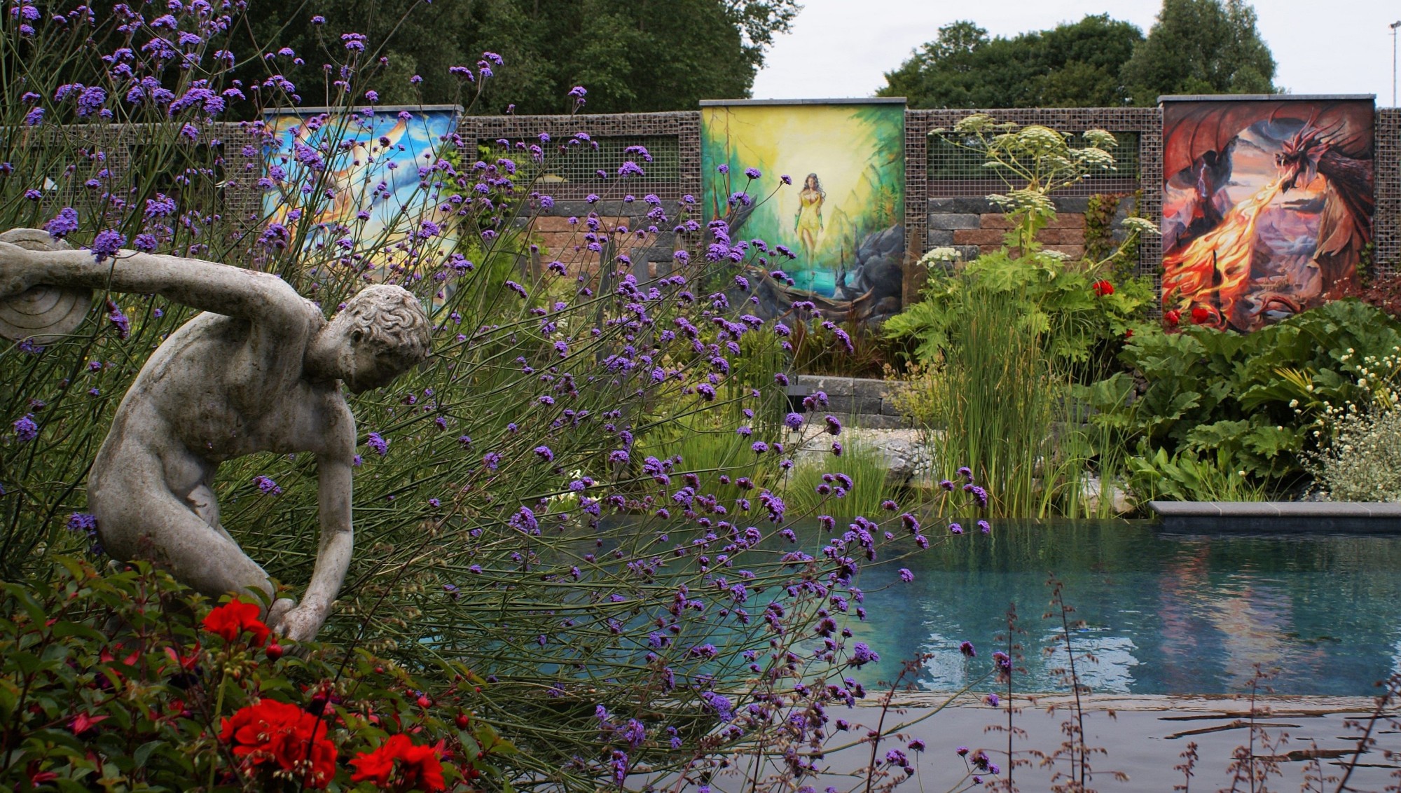 Terug naar overzichtParadijselijke tuin met zwembad, watervallen, muurschilderingen en beelden te Rotterdam